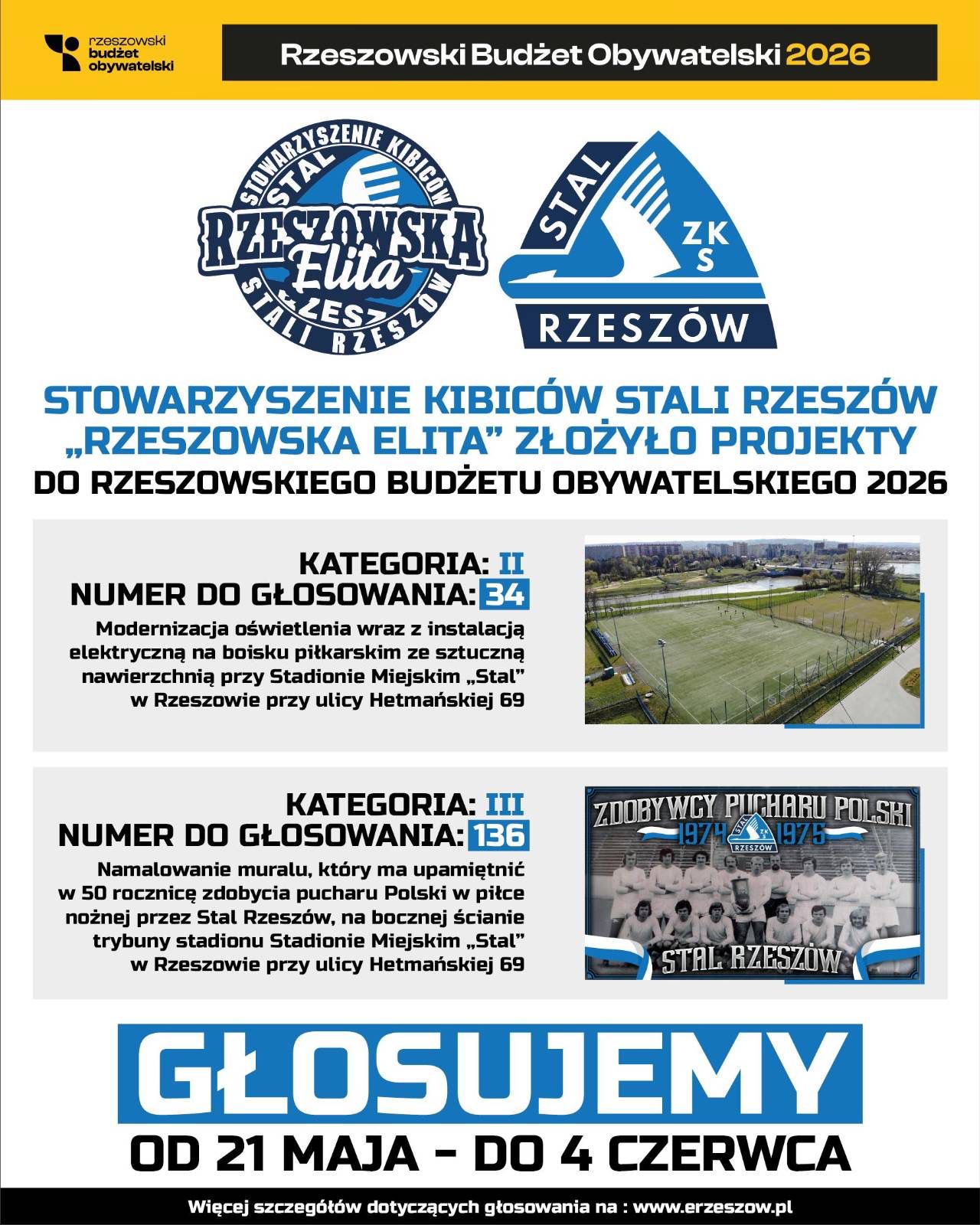 Stowarzyszenie Kibiców Stali Rzeszów „Rzeszowska Elita” zgłosiło do Rzeszowskiego Budżetu Obywatelskiego 2026 dwa projekty związane z naszym Klubem. Teraz wszystko w rękach mieszkańców – głosowanie trwa od 21 maja do 4 czerwca!