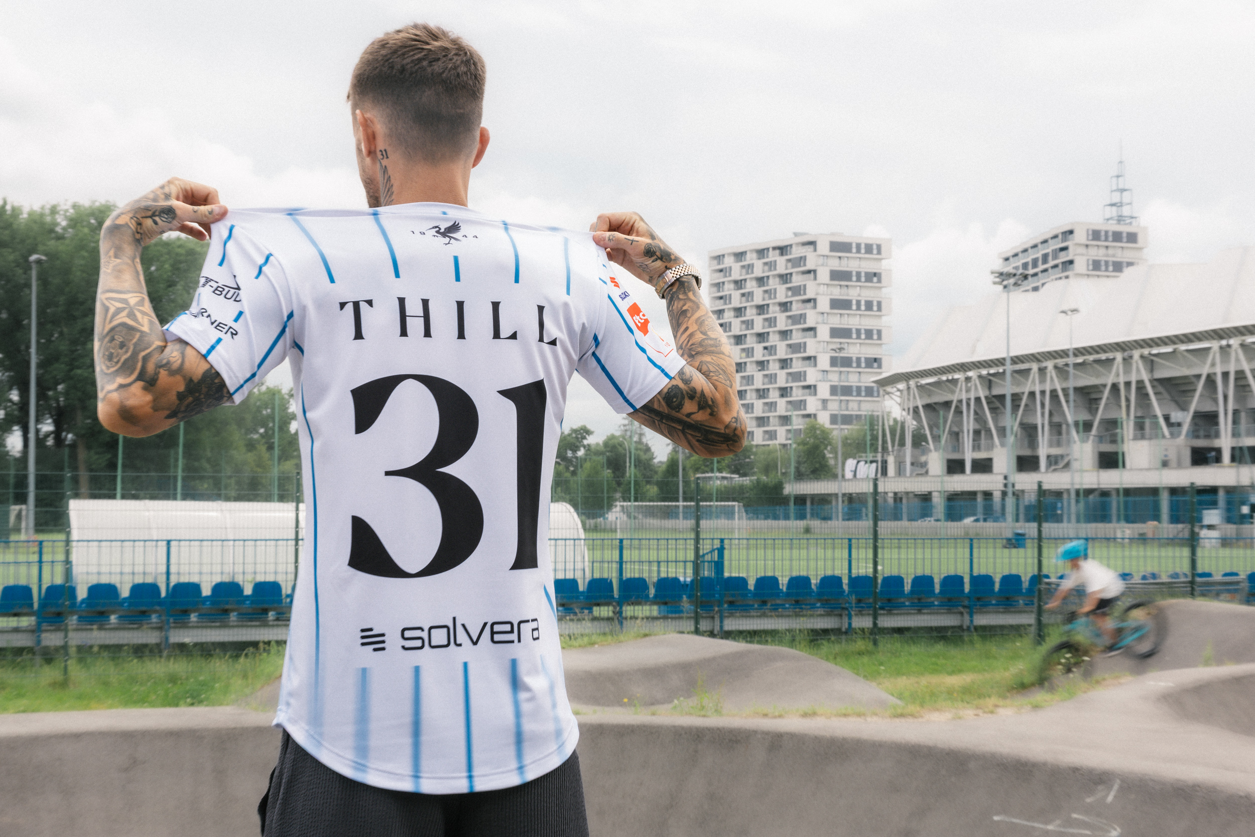 Koszulki Stali Rzeszów na sezon 2025/2026 to zestaw starannie zaprojektowanych trykotów, które łączą nowoczesny styl z tożsamością klubu. Koszulka domowa utrzymana jest w białej kolorystyce z cienkimi, pionowymi, niebieskimi pasami. Pasy te mają dynamiczny efekt zanikania ku dołowi, co dodaje lekkości i nowoczesnego wyglądu. Charakterystycznym detalem tej koszulki jest żuraw z rozpostartymi skrzydłami oraz datą „1944” – nadrukowany na karku, nawiązujący do roku założenia klubu. Tył koszulki zdobi nazwisko zawodnika i duży numer, oba w eleganckim, czarnym kroju pisma.