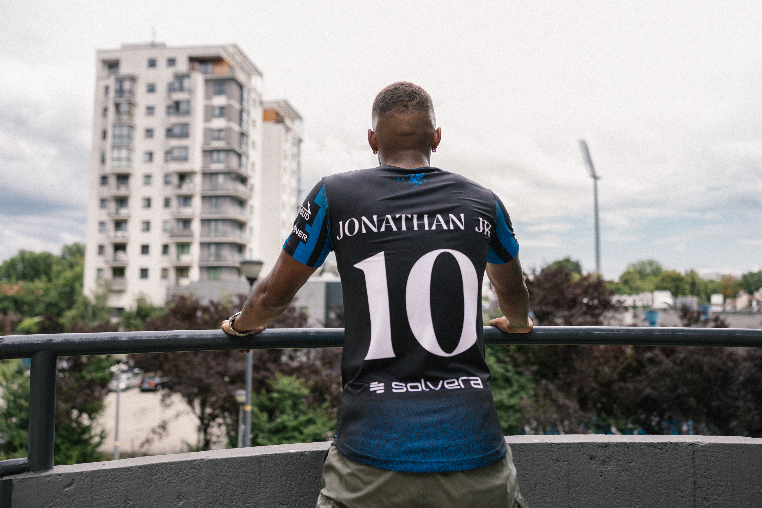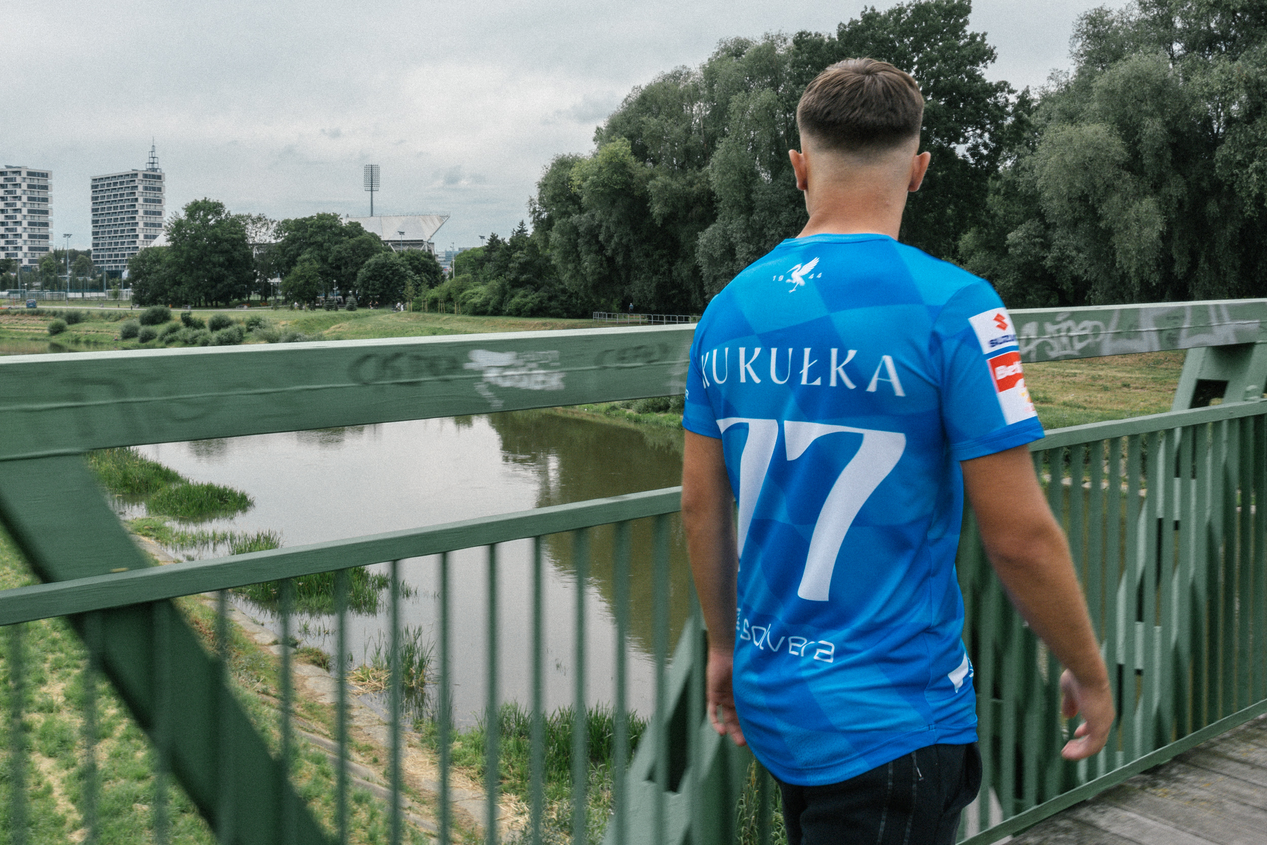 Koszulka wyjazdowa została zaprojektowana w odcieniach błękitu i niebieskiego, ułożonych w geometryczny, tonalny wzór, tworząc swego rodzaju szachownicę. Koszulka ma sportowy, młodzieżowy charakter, a jej tył zdobi nazwisko zawodnika oraz numer w białym kolorze. Tak jak w przypadku koszulki domowej, na karku znajduje się symbol żurawia z datą 1944.